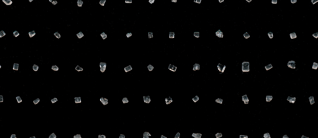 >>Taxonomy I<< discusses the meaning of classification and human cognitive pattern through manually arranging appx. 900 ordinary sugar crystals. Due to manual work, the crystal array shows an organic deformation. Sugar as a very important energy source of many lifeforms, with its different shapes of the same substance, inspires an analogy about different lifeforms often share the same origin.